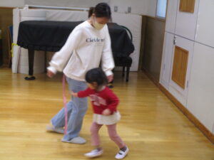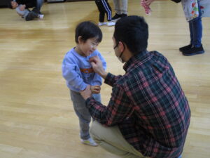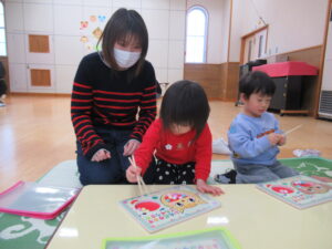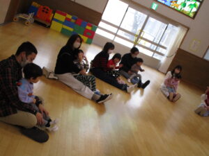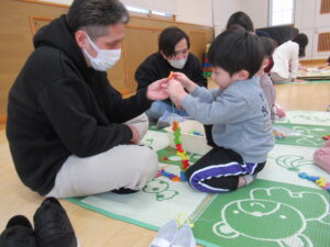 次は、お広場へ移動してレクレーションをして遊びました。椅子取りゲームや親子でいっぱい走り回ったしっぽとり。スキンシップができ笑顔いっぱいな子どもたち!また、コーナー遊びでは、指先を使う遊び(箸遊び・ひも通し・リモーサ)や自分で製作したこまやけん玉遊びを楽しみました。指先を使ってじっくり集中して遊ぶ姿もあり、成長している姿を見て頂くことができました。