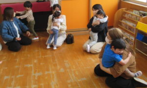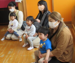 お昼寝が終わり、おやつタイムにお家の方とご対面。突然お父さんお母さんがいたので驚いた様子でしたが、一緒に過ごせてとてもうれしそうにしていました。おやつのマスカットゼリーはスプーンを使用したので、正しい持ち方を伝えられる良い機会となりました。おやつ後は「おべんとうバスシアター」を見たり、「だいすきだい」の歌に合わせてこちょこちょ。ステキな笑顔がいっぱい!楽しいふれあいタイムでした。 お忙しい中参加して頂きありがとうございました。一年間よろしくお願いいたします。