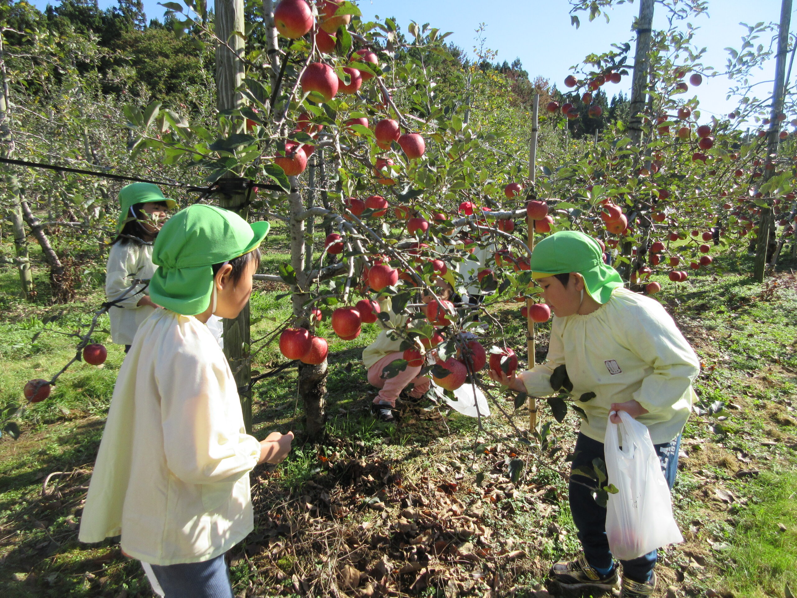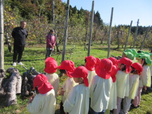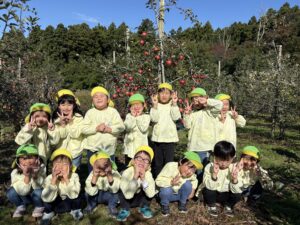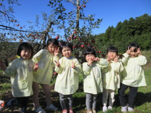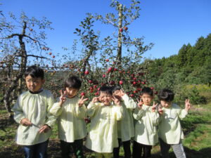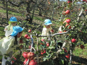 マイクロバス、園バスに乗って西目のりんご園へ。バスから木になっているりんごを見つけると「りんごだー!!りんごの木は可愛いね」と収穫するのが更に楽しみになっていた子どもたちです。りんご園に着き、りんごの収穫の仕方を聞いて、真っ赤で大きいりんごをじっくり選んで収穫していました。