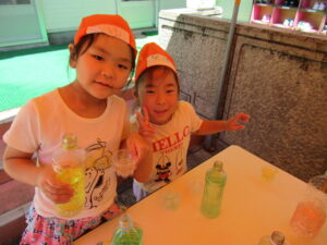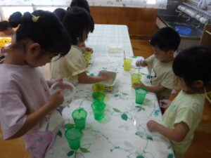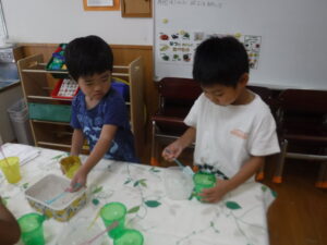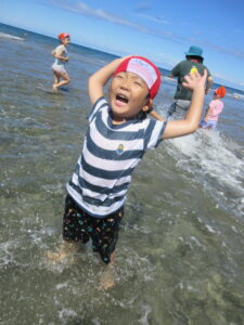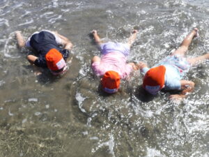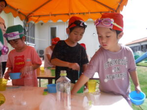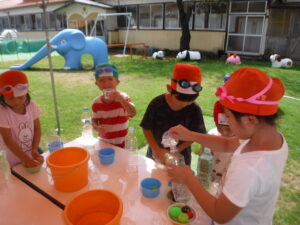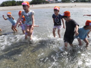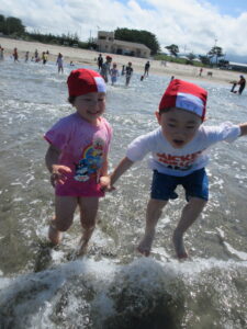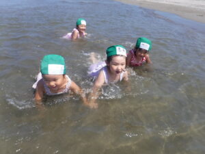 海では、ワニ歩きをしたり、漁師さんのように潜ったりと全身で楽しんでいましたよ。ちょっと波を怖がっていたお友だちも何度も遊びに行ったことで「楽しい!」に変わっていましたよ。お盆明けからは、プールのほかに色水や泡、寒天で遊びました。