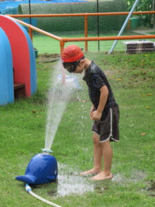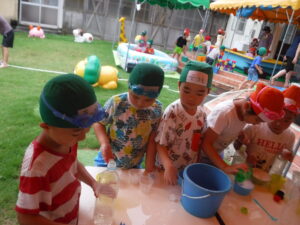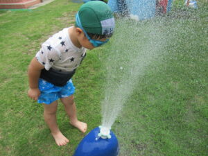 水遊びでは、水鉄砲や水車、じょうろで水を流したり、くじらの噴水で水を浴びたりと、思い思いに遊ぶ姿が見られました。プールでは、潜ったりするお友だちもいましたよ。