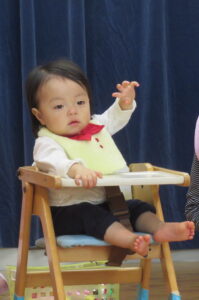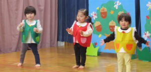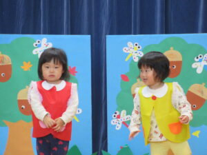 1歳児のたんぽぽ組さんは、歌や踊りが大好き。2グループに分かれて『どんぐりころころ・手をたたきましょう』『とんぼのめがね・バスごっこ』など秋の歌あそびを披露しました。最後はクレヨンに変身して『どんないろがすき』「あか!」「あお!」と、色の名前を言いながら、歌って踊ってかわいいステージ発表となりました。