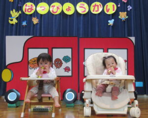 0歳児のつぼみ組さんは、初めての発表会。大好きな絵本のおべんとうバスに乗って、歌ったり、お返事をしたり、マラカスを鳴らしたり、かわいらしい姿がたくさん見られましたね。そして会場のみなさんにも参加してもらい楽しむことができました。