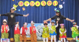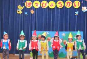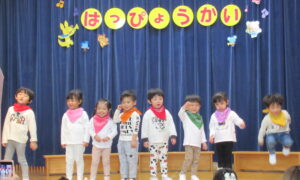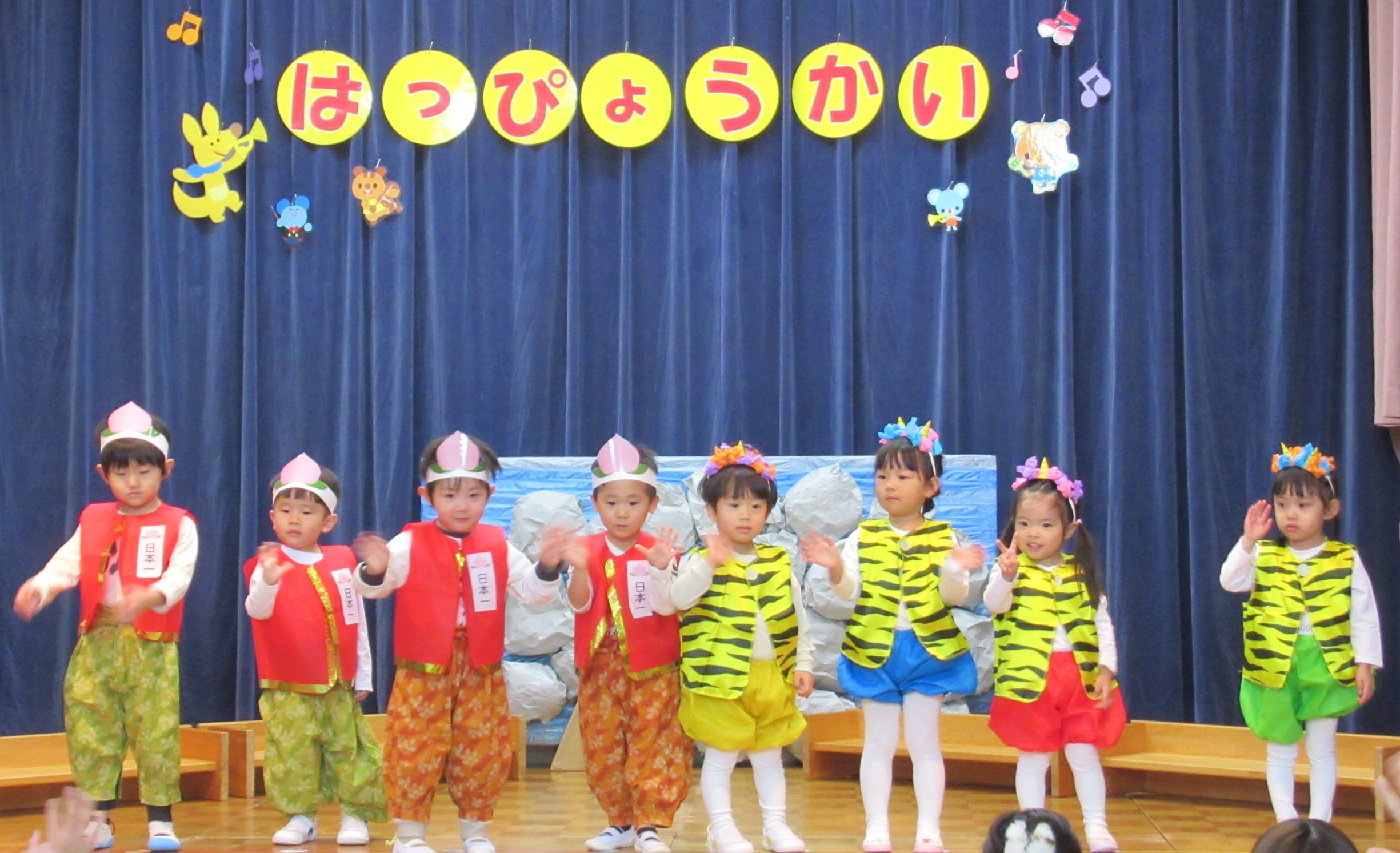 2歳児さくら組さんは、ミニオペレッタ『がんばれ!ももたろう』歌遊び『おなまえいえるかな』『だいじょうぶ?ズコッ』ももたろうと鬼になりきって歌いながらリズムに乗って踊る姿は、元気いっぱいでとてもかわいらしかったですね!また「ズコッ」と全身を使って、ずっこける姿に会場から笑い声があり、ますます楽しくなる子どもたちでした。最後のあいさつは、さくら組全員の元気な声で終了。一人ひとりいろんな成長が見えた発表会でした。