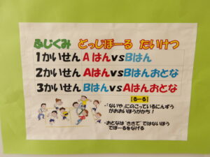 朝の会の後は、みんなで「はないちもんめ」を楽しみました。自分のチームのお友だちやお家の方が相手チームに取られないように!と白熱した戦いになりました。子どもたちの気合十分な姿がとっても微笑ましかったですね。