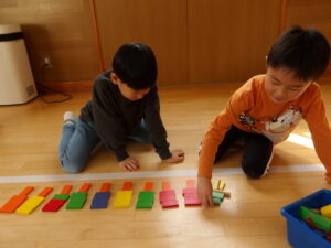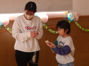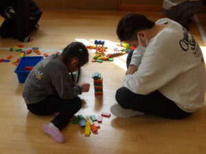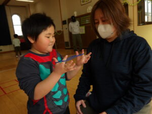 飛行機飛ばしやドミノ、けん玉、あやとりなど、お友だちと一緒に遊ぶ様子を見て頂いたり、お家の方と一緒に楽しんだりして、とても暖かい雰囲気で参観がスタートしました。