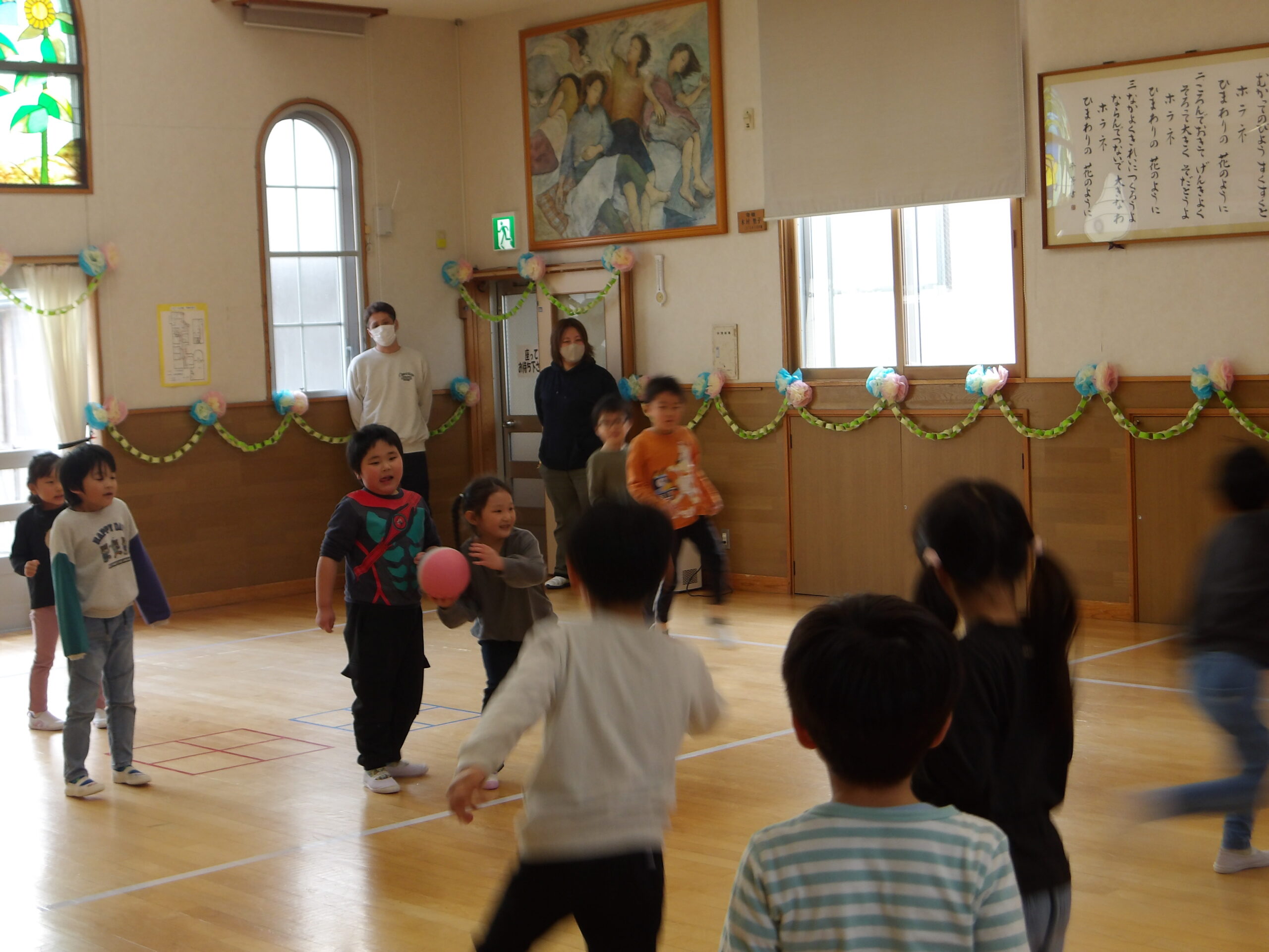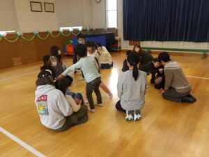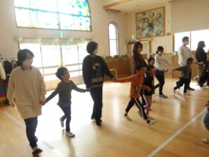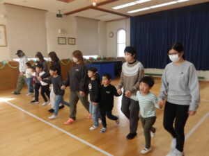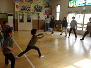 朝の会の後は、みんなで「はないちもんめ」を楽しみました。自分のチームのお友だちやお家の方が相手チームに取られないように!と白熱した戦いになりました。子どもたちの気合十分な姿がとっても微笑ましかったですね。