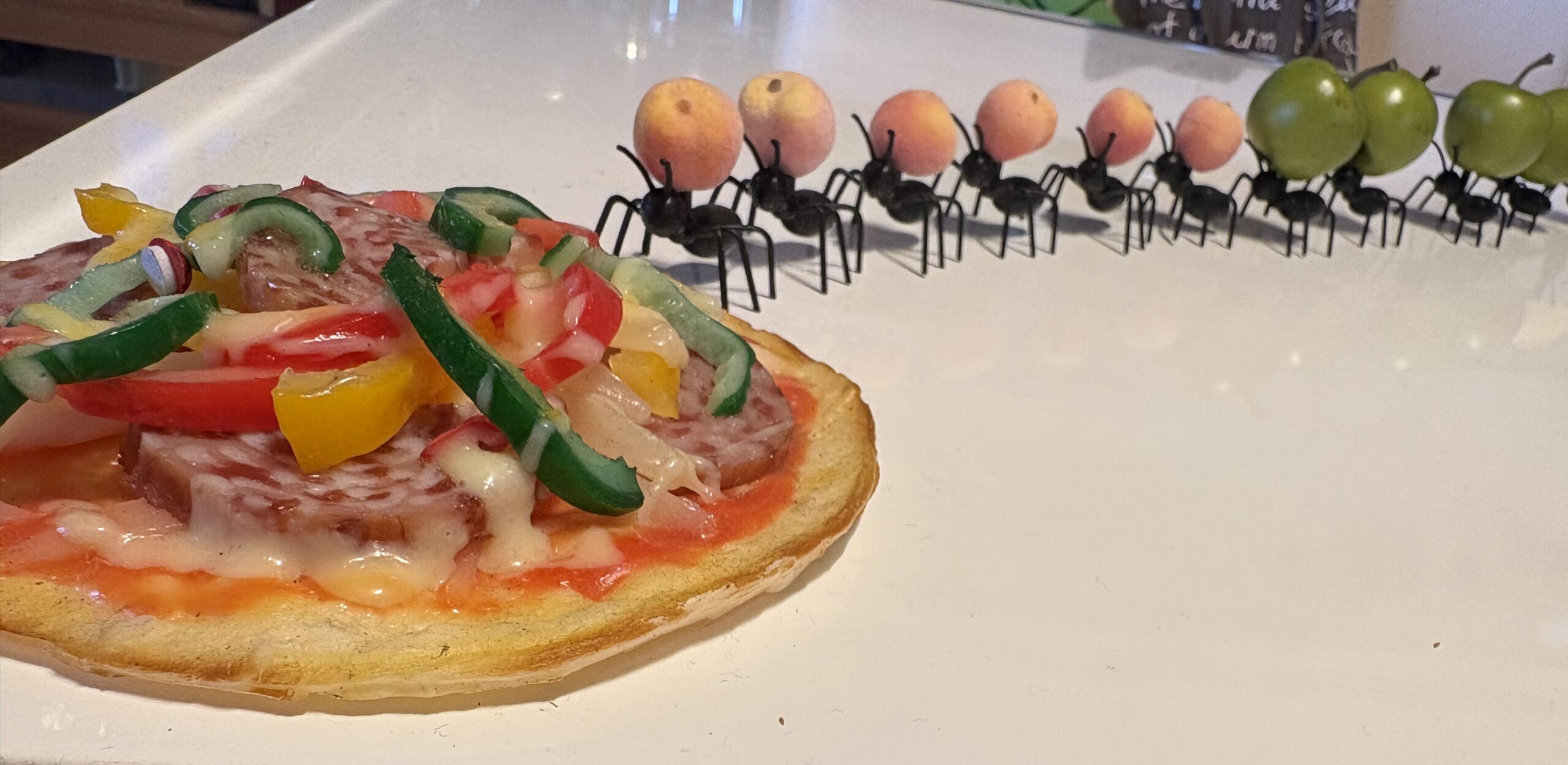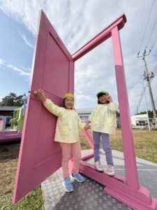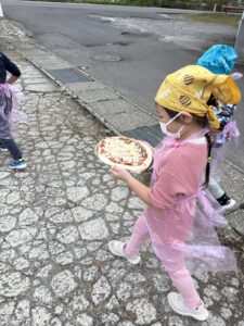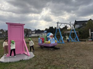 ピザを食べた後は、外の遊具であそびました。「どこでもドアでどこに行きたい?」とイメージを膨らませて会話を楽しんでいましたよ。